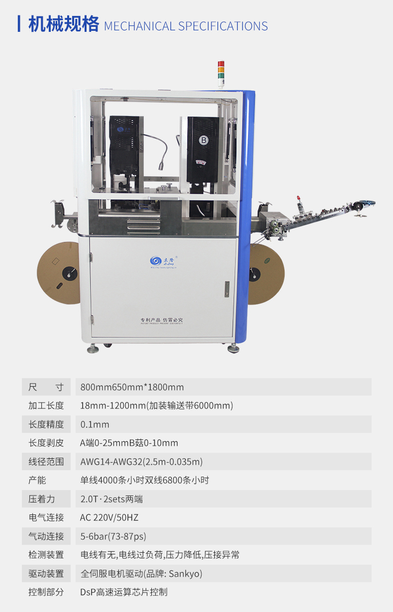 本機采用全封閉式防護罩機臺設(shè)計,外觀整體美觀又大大提高了安全性,全封閉式防護罩具有開蓋報警裝置。獨立防線裝置,放打結(jié)斷線效率更高,穩(wěn)定送線、提升效率,增強產(chǎn)品線長精度。具有收紙自動感應(yīng)功能,采用全伺服電機和進口精密部件,讓機器更穩(wěn)定更精確。本機可裝伺服端子機,大大提高了生產(chǎn)效率,操作簡單易懂。