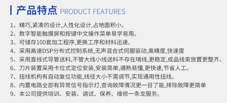 8.扭線機構有自動復位功能,線徑大小不需調節(jié),施先通用性扭線。