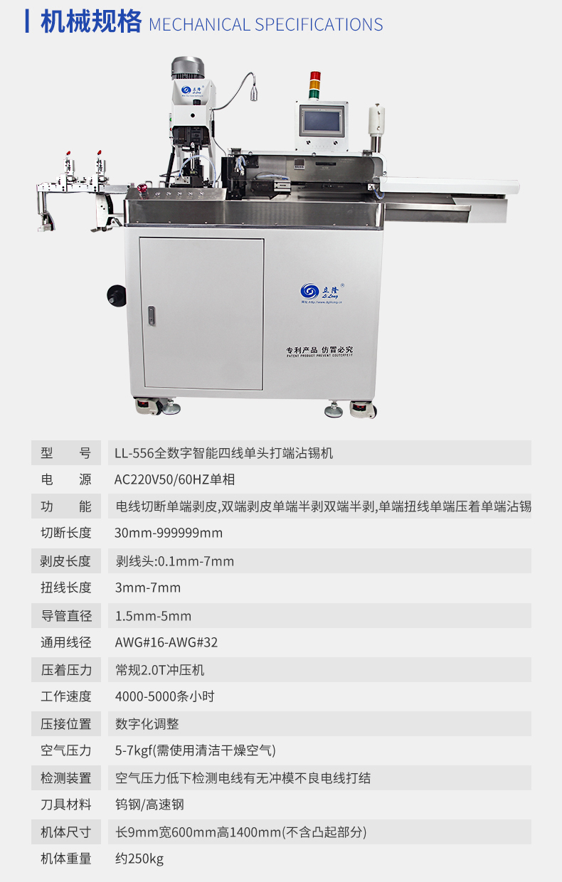 LL-556全數(shù)字智能五線單頭打端沾錫機   產(chǎn)品說明:   1.精巧,緊湊的設計,極佳人性化設計,占地面積小。   2.數(shù)字智能觸摸屏和按鍵中文操作菜單易學易用。   3.可儲存100套加工程序,更換工序和材料迅速。  ...